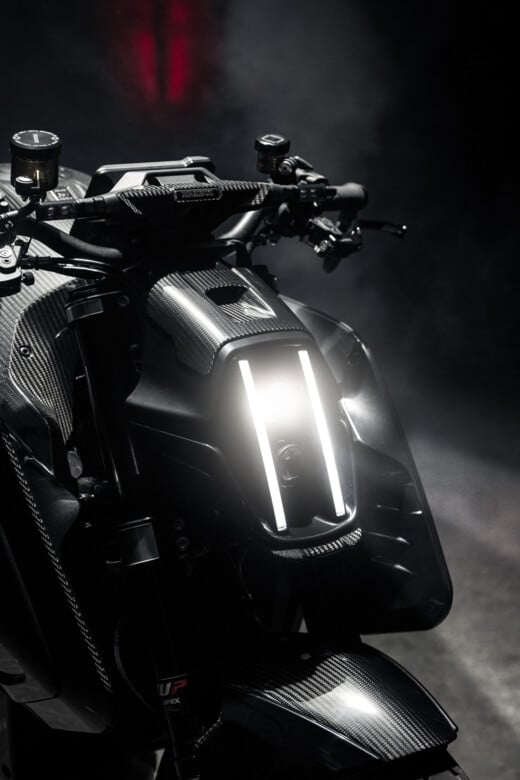 Visually, the BRABUS 1400 R Signature features a “Midnight Veil” black carbon fibre bodywork and WIDESTAR aerodynamic enhancements for an aggressive, muscular stance, including the front fender, side panels, and fuel tank fairing padded with high-quality Dinamica microfiber. At the front, the motorcycle features a unique LED headlight with a striking daytime running light, inspired by Brabus’s signature stripes.