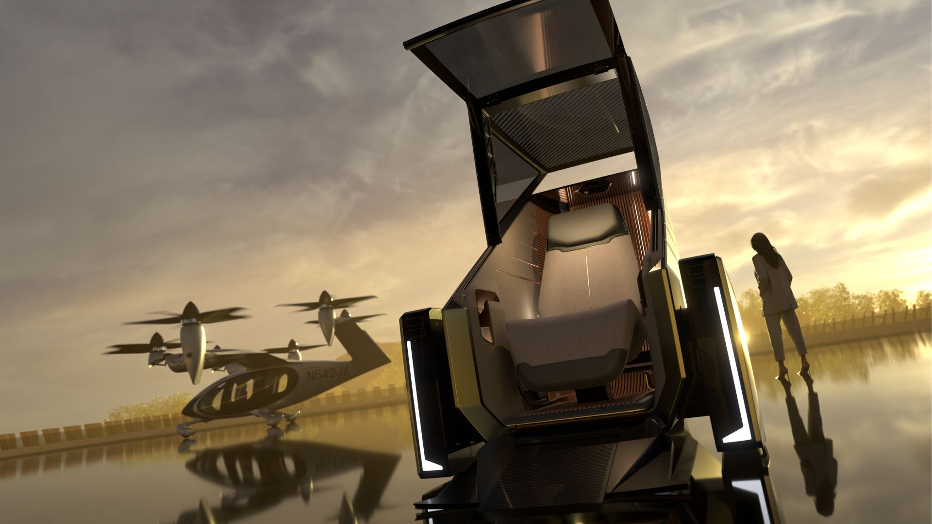 An electric Vertical Takeoff and Landing prototype, the Lexus Joby is a pilot-operated aircraft that seats four, can reach speeds up to 200mph, is up to 100 times quieter than a conventional helicopter, and uses six electrically driven, tilting propellers powered by four battery packs.
