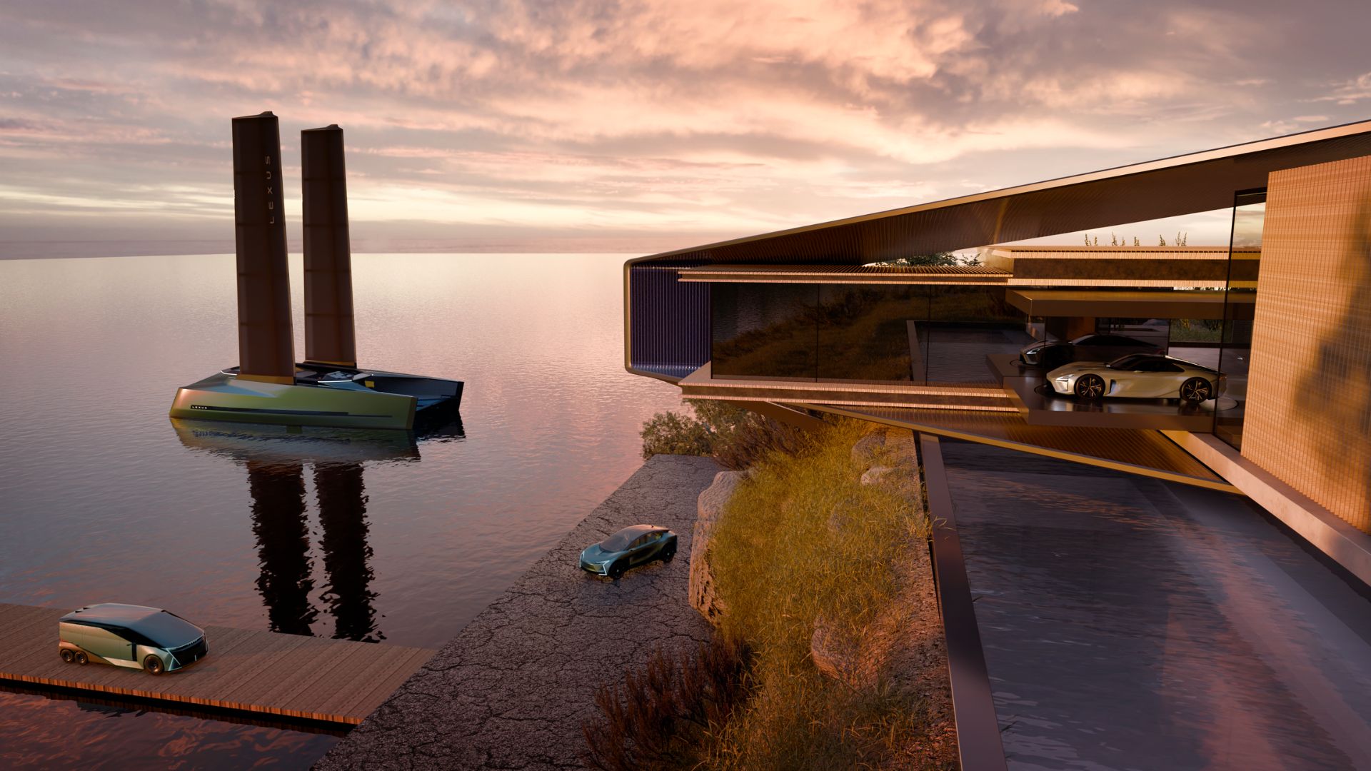 The Lexus Catamaran has been devised to stand as an example of sustainable sailing. Wind turbines and solar cells are said to replenish the batteries that itself will power the electric motors and navigation systems. Built with lightweight composite materials, it features AI-powered autopilot and rigid airfoil-style wing sails to minimise crew effort. The Catamaran can achieve a 15-knot cruising speed while also being equipped with a hydrogen fuel cell. Amenities include four bedrooms, a galley, bathroom and fly deck.