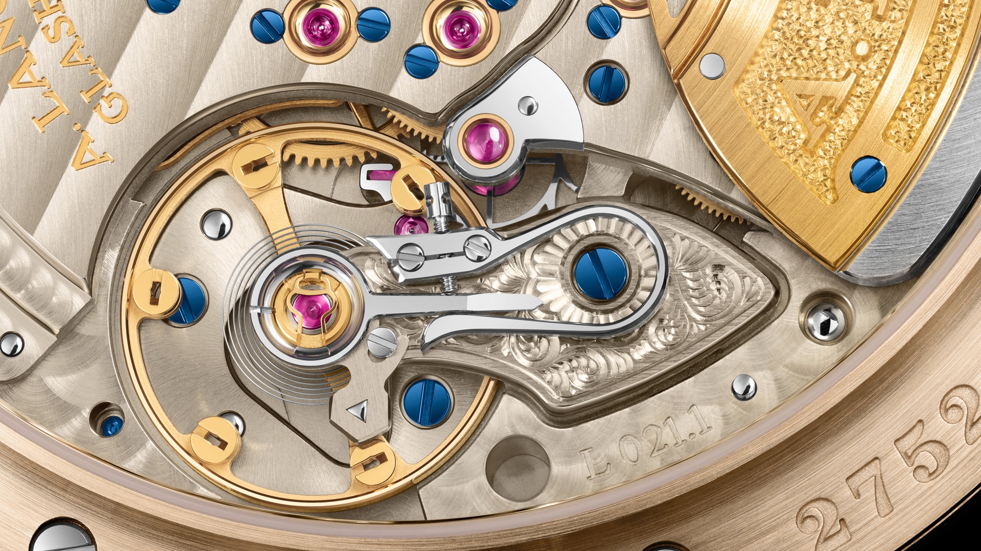 Movement features: Lever escapement. Free-sprung and shock-resistant balance wheel with eccentric poising weights. Lange manufactured superior-quality balance spring. Precision beat adjustment system with lateral setscrew and whiplash spring.