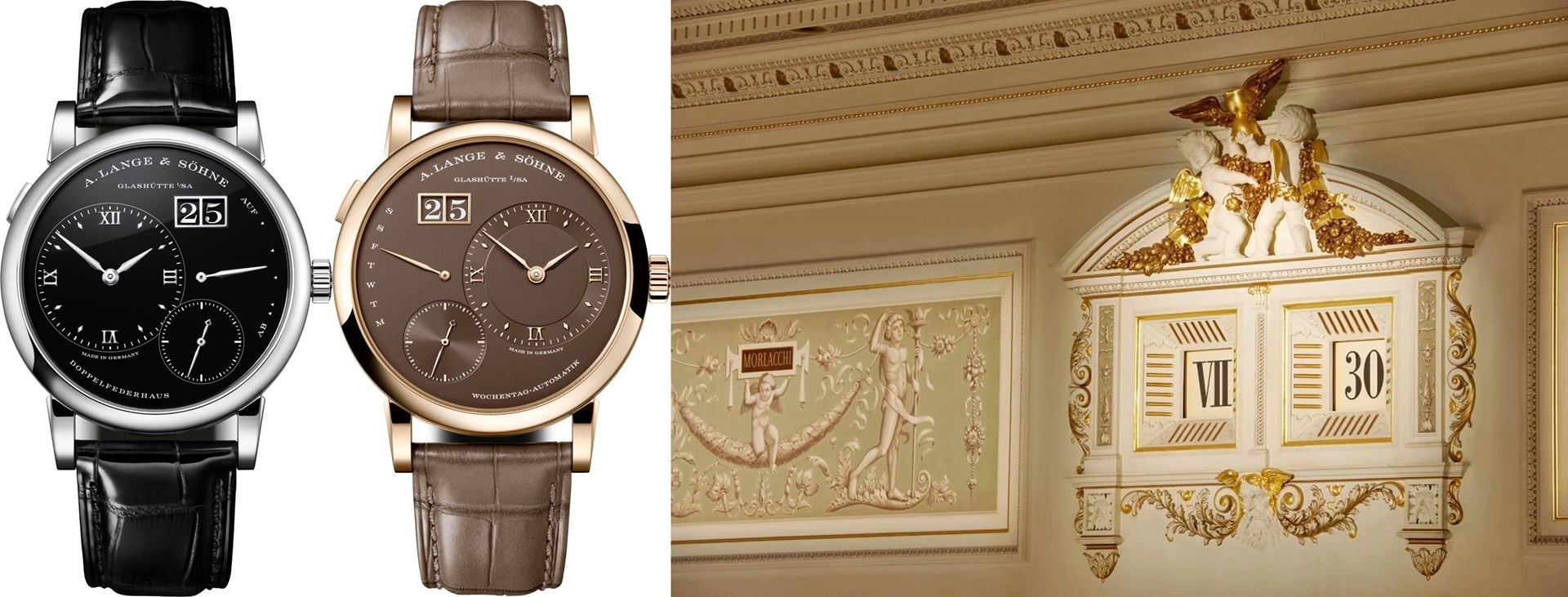 Hours and minutes. Subsidiary seconds with a stop-seconds function. Lange outsize date. Retrograde day-of-the-week display. Crown at 3 o’clock for winding and time-setting. Pusher at 10 o’clock for date-setting. Corrector at 9 o’clock for changing the day-of-the-week.