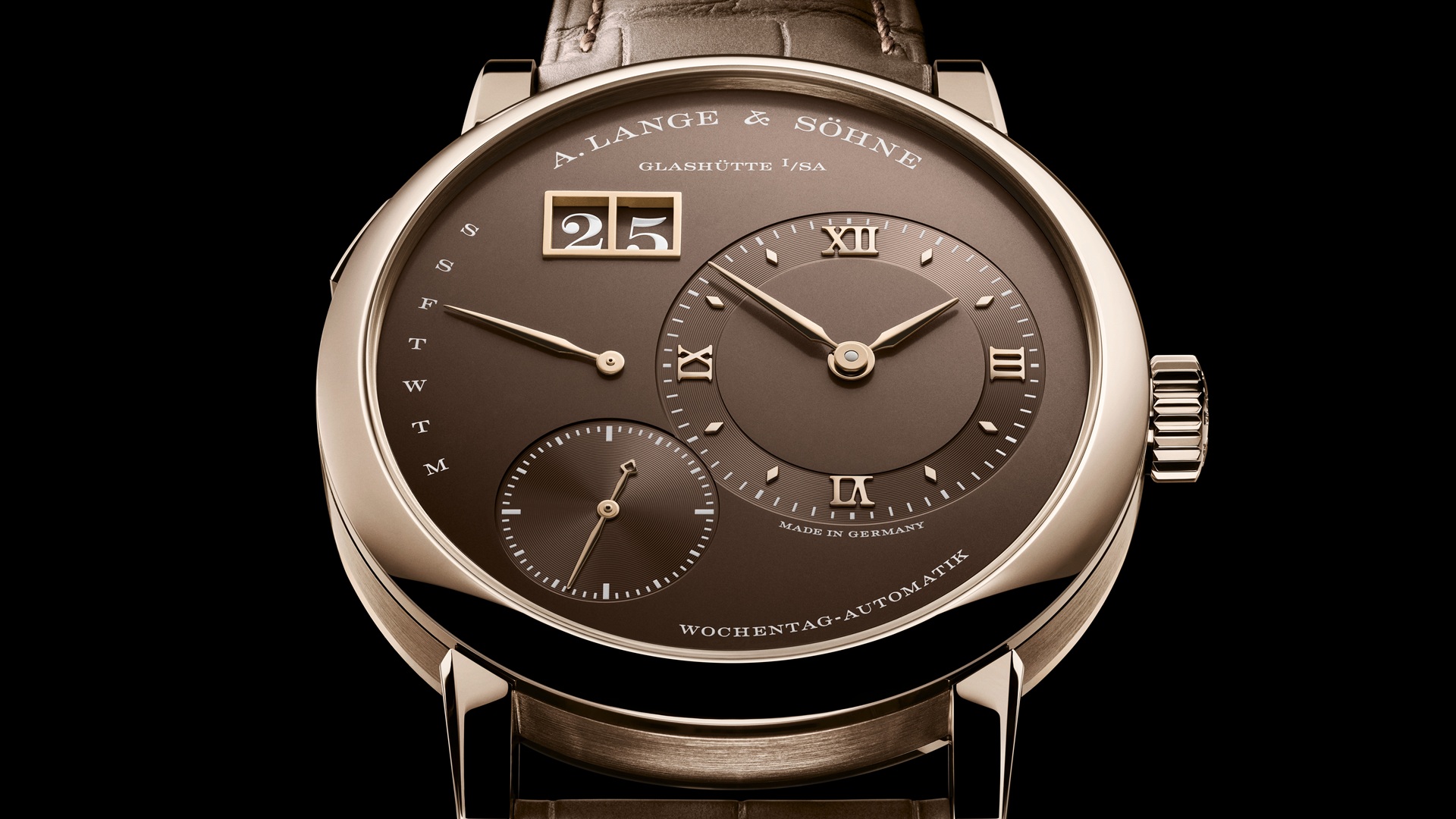 Brown dial made from 925 silver. Hands, hour-markers (both the Roman numerals and diamond-shaped) and the frame for the outsize date are made from 750 gold.
