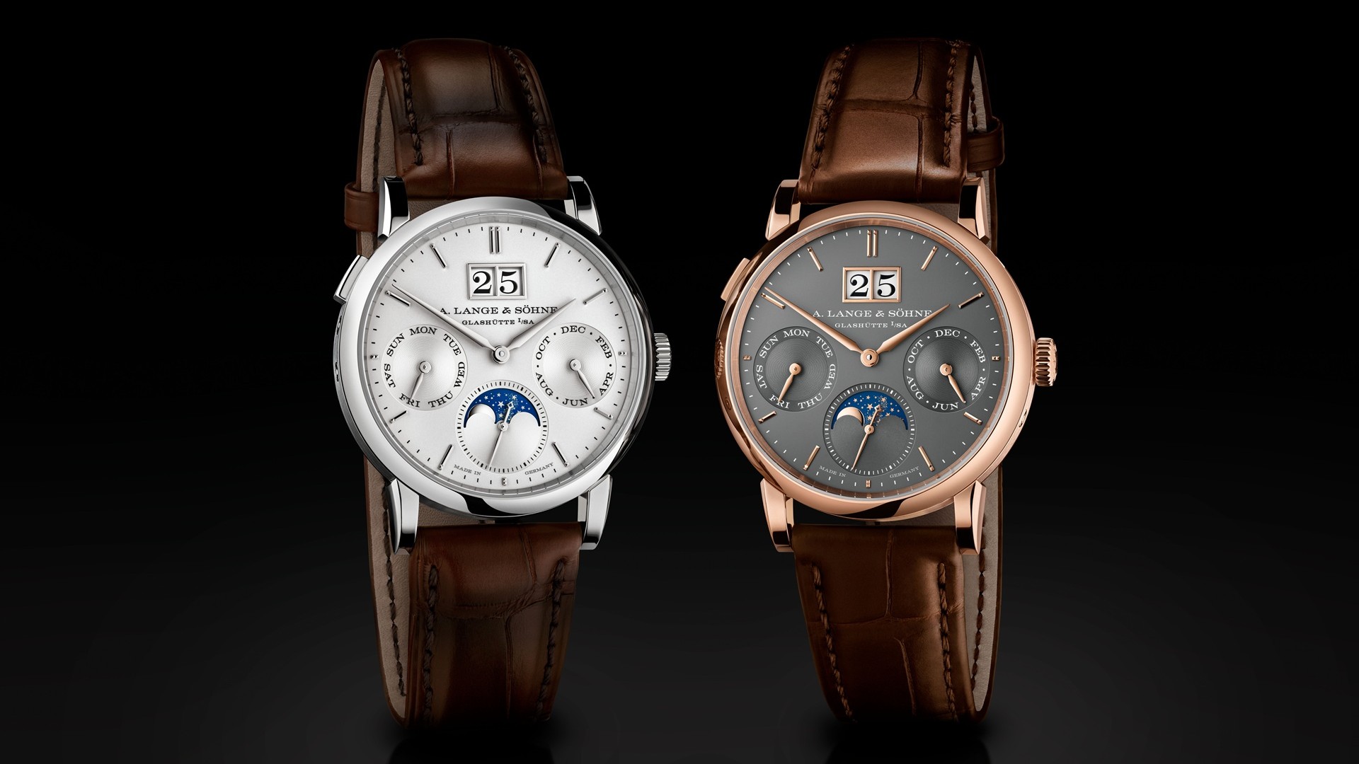 Yes. Both versions are powered by Lange manufacture calibre L207.1, a new automatic movement that drives the hours, minutes, small seconds with stop seconds function, moon phase display and annual calendar functions of outsize date, day of the week and month.
