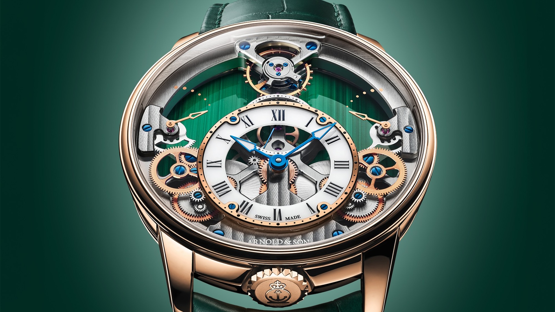 Arnold & Son has introduced the Time Pyramid 42.5 Malachite Editions – a three-hand watch with two power reserve indicators – featuring a pyramid-shaped openworked movement set against a malachite disc. Inspired by an 1830s “ornamental precision regulator clock” created by John Roger Arnold – son of the brand’s namesake founder John Arnold – it is available in an 18K 5N red gold or 950 platinum case, both editions limited to 8 pieces each. It joins the lineup of the model that includes a blue aventurine version in both red gold and platinum.