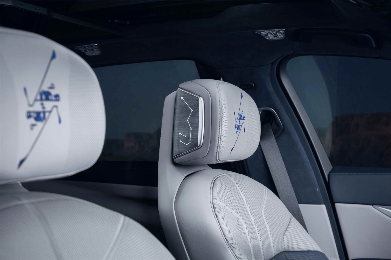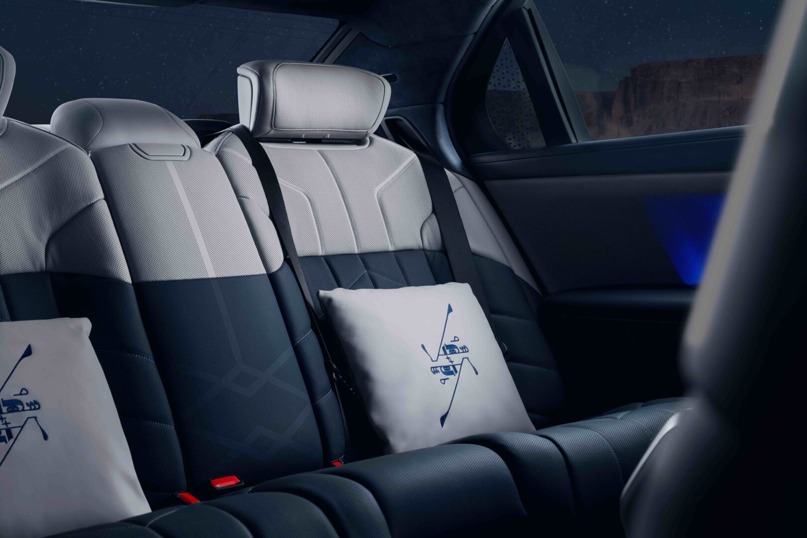 Inside, the BMW Individual Edition showcases exceptional attention to detail. The Suhail constellation and logo are exquisitely embroidered onto the headrests and cushions. They are crafted onto the C-pillars, side headrests, and dashboard, with BMW Sky Lounge enveloping passengers in a subtle celestial narrative. The finest stitched BMW Individual Merino Leather, with BMW Individual Taupe Grey/Night Blue elements, is complemented by Oak mirror-finish wood trim and grey-metallic high-gloss.