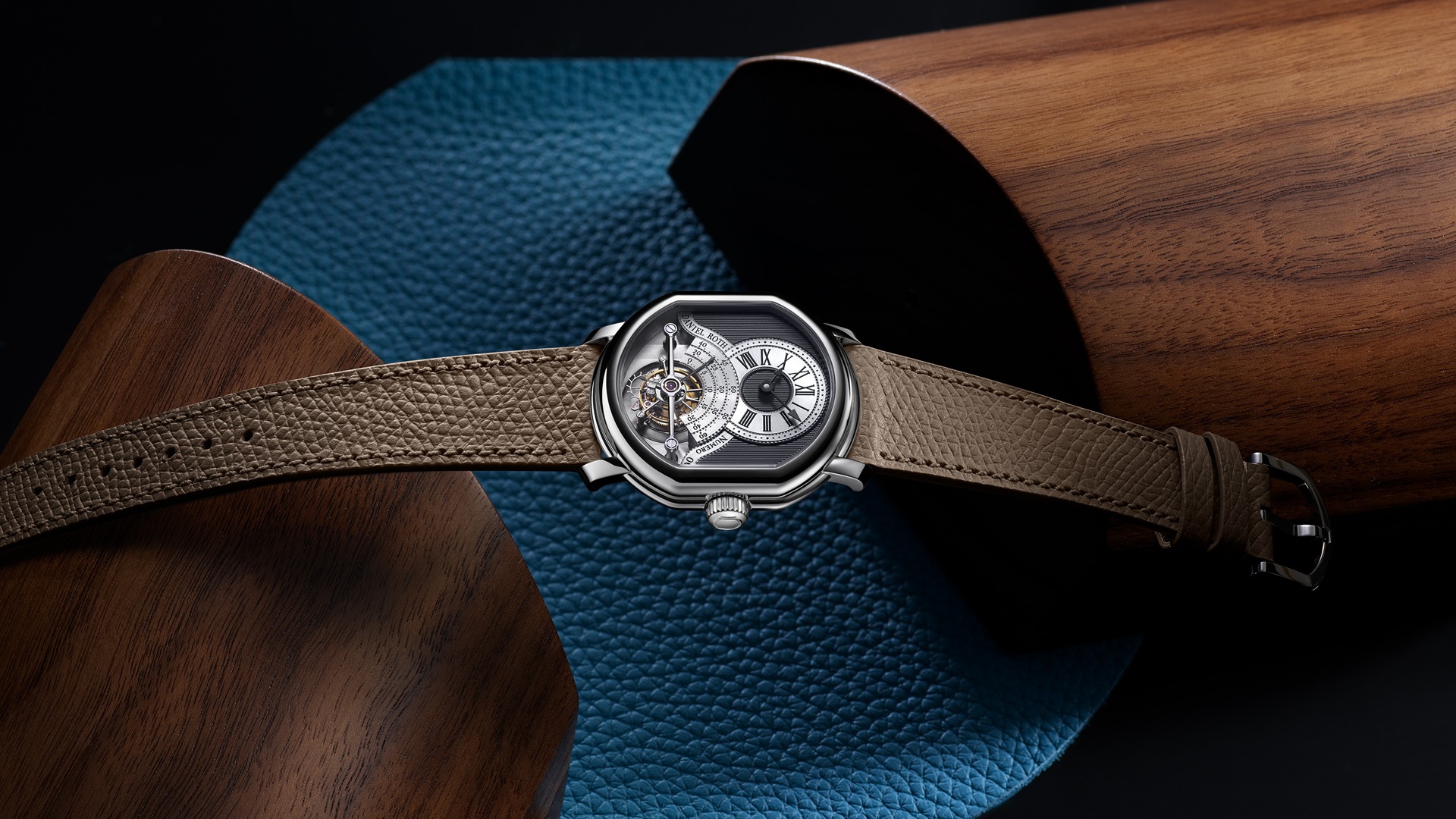 Powered by Calibre DR001, a manually wound movement that drives the hours, minutes, and one-minute tourbillon. It was “developed and assembled by La Fabrique du Temps Louis Vuitton under the supervision of Master Watchmakers Michel Navas and Enrico Barbasini.” Dimensions: 31 * 28 mm. Thickness: 4.6 mm. Parts: 206. Jewels: 19. Frequency: 21,600 vph or 3 Hz. Power reserve: 80 hours (approximately).