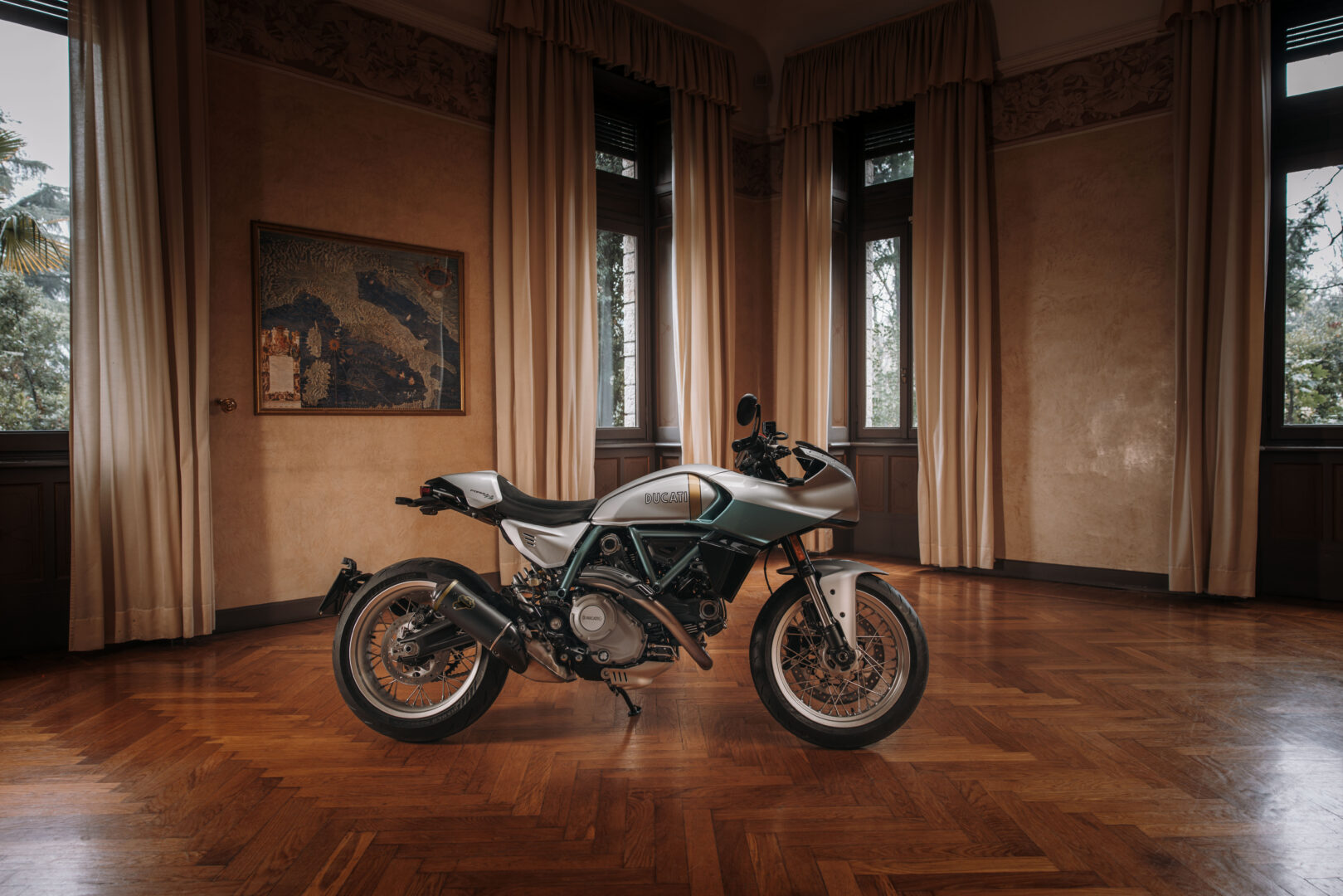 The design of the Ducati Formula 73 takes inspiration from the 1973 750 Super Sport’s iconic cafe racer aesthetics and livery. The Formula 73 features a striking green frame, gold pinstripes, and the original race number “14” on the fairing.
