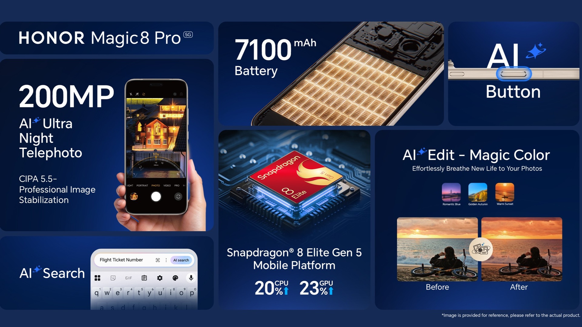 The device is equipped with a 200MP AI Ultra Night Telephoto camera, delivering clarity in long-distance and low-light scenarios. An upgraded AI Ultra Night Portrait mode ensures precise colour accuracy, while AI Magic Colour and a new AI Editor enable refined creative adjustments. Powered by the Snapdragon 8 Elite Gen 5 mobile platform, the Magic8 Pro also features a 7,100mAh HONOR Silicon-carbon battery, AI Button, AI Search, and AI Documents to support productivity.