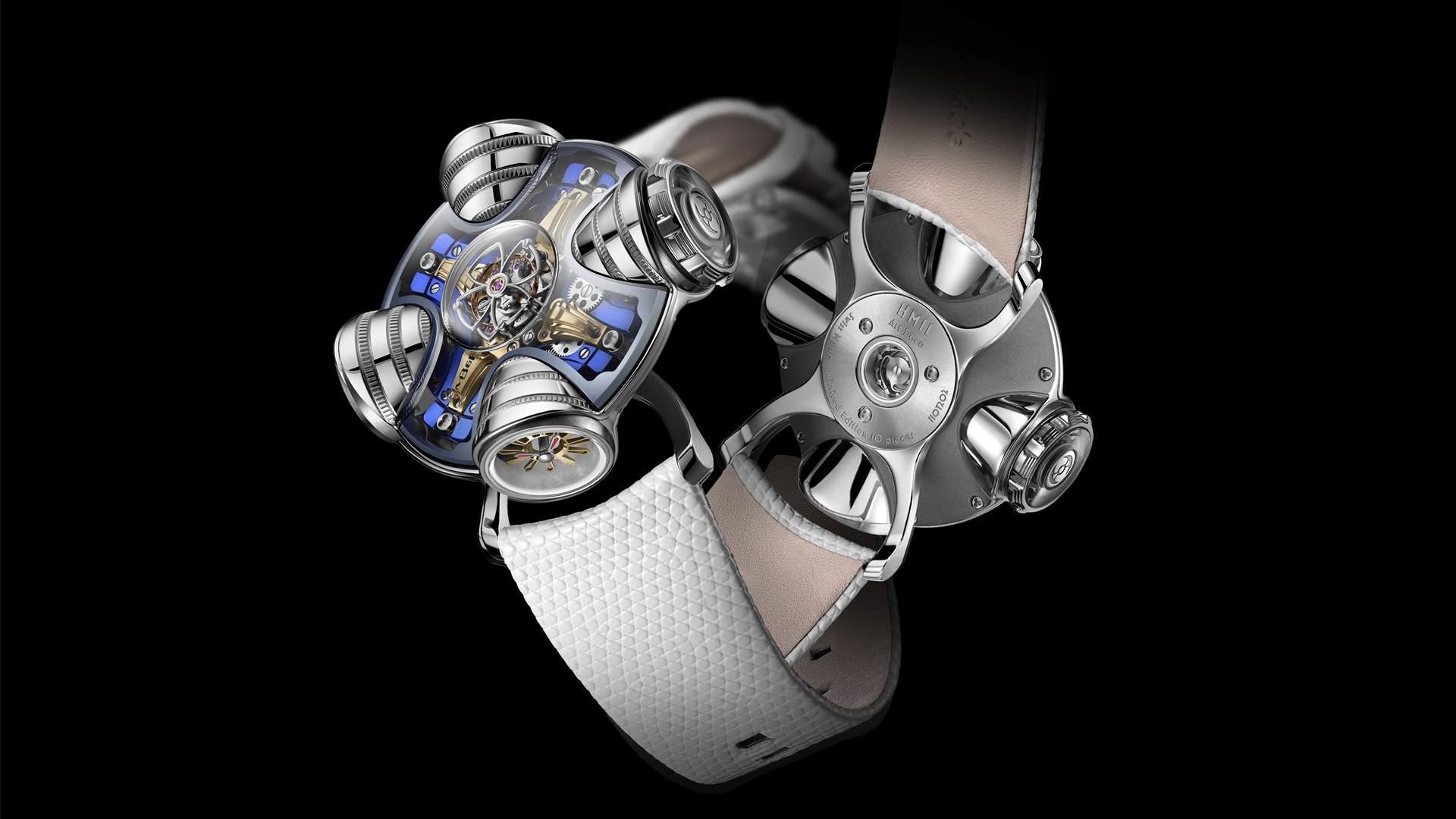 The HM11 Art Deco builds on the “miniature home” concept of the HM11 Architect yet one that is inspired by 1930s Art Deco. Designer Maximillian Maertens has reinterpreted Max Büsser and Eric Giroud’s design “with the geometry, verticality, and graphic rhythm of 1930s design. Sunbeam-pattern dials, stepped architectural bridges, reworked sapphire profiles, and red translucent enamel hands evoke the era’s cinemas and skyscrapers, creating the impression of a miniature skyline on the wrist.”