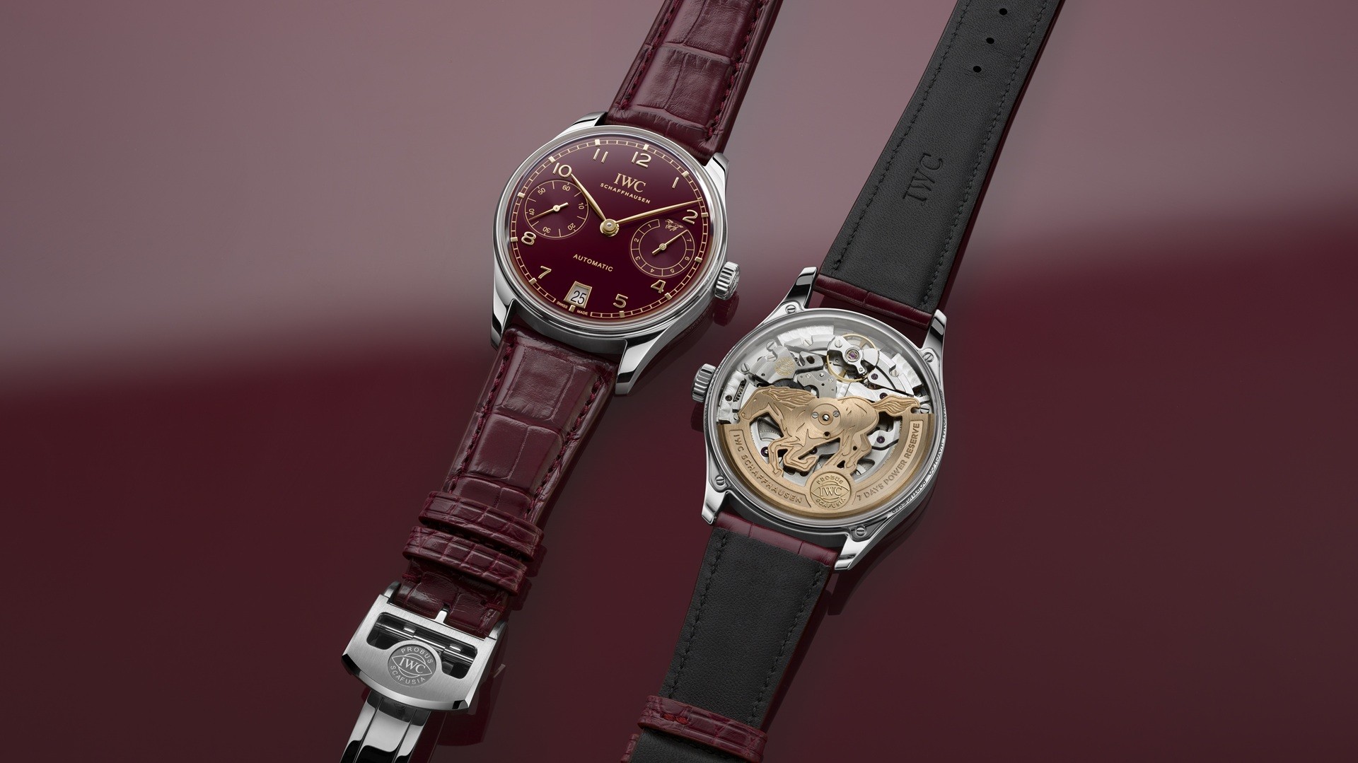 The Portugieser Automatic 42 Year of the Horse celebrates Chinese New Year using the Portugieser Automatic 42 as a base. With its horizontal subdial layout for small seconds and power reserve display – it is among IWC Schaffhausen’s most iconic references. Its burgundy-coloured dial features gold-plated hands and applied gold Arabic numerals and hour-markers, snailed subdials, and a railway track hour and minute scale.