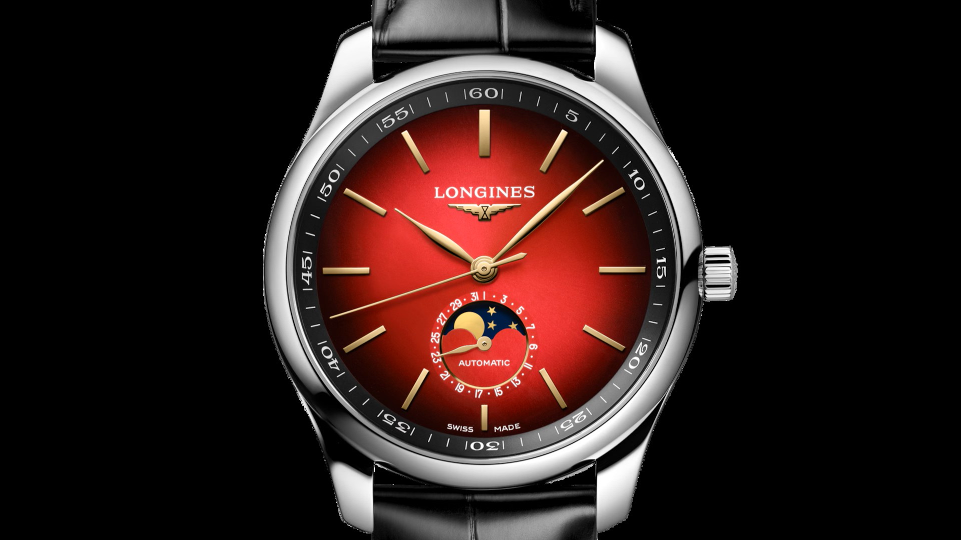 The Master Collection Year of the Horse Edition showcases a sunburst red gradient dial. It features gilt hands, and applied hour-markers. The blue sky of the moon-phase display at 6 o’clock contrasts well with the dial. The outer flange features an hour and minute scale.