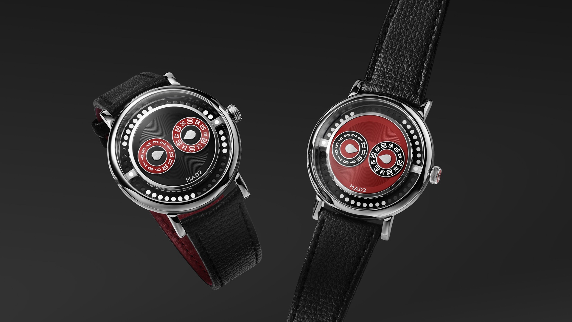 Left: R&B. Right: REDemption. The dial evokes the design of a The subdial on the left indicates the hours and on the right, minutes. On the left image, time is 9.10 and on the right image, 1.45.