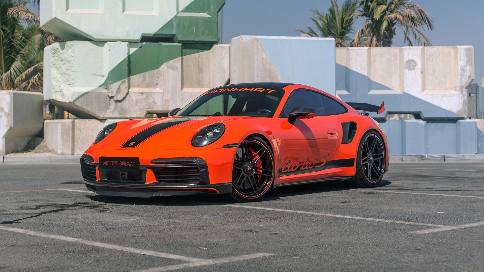 The tuned 911 Turbo S rides on forged and satin-finished Manhart Concave One rims, which also don an orange trim line to match the body colour. Complementing those custom wheels are a bunch of carbon trim elements, including the front spoiler lip, air intakes, mirror caps, side sills and the extendable rear wing. The black stripes on the bright orange body colour make the car a head-turner, and the same dual-tone scheme is carried over to the interior with leather upholstery and Manhart-branded floor mats.