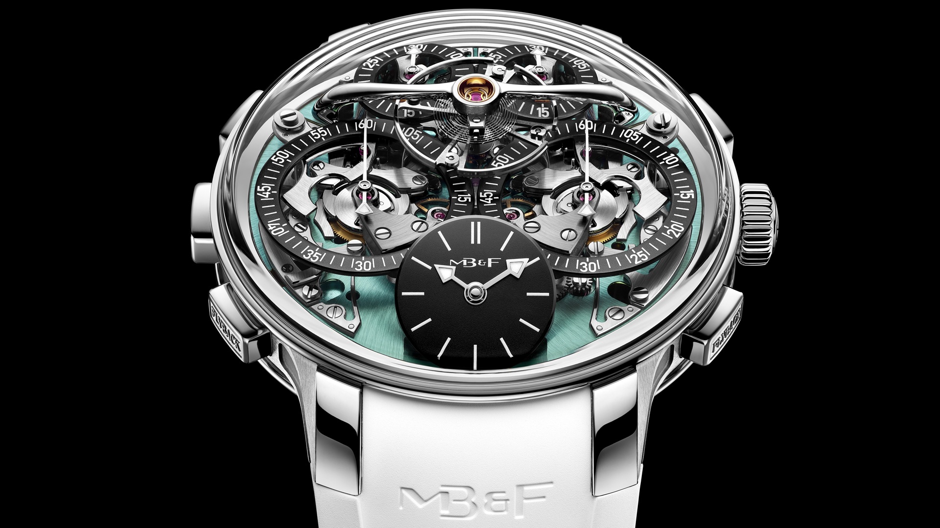 It is powered by a “fully integrated dual chronograph flyback system developed for MB&F by Stephen McDonnell, featuring Twinverter switch allowing multiple timing modes.”