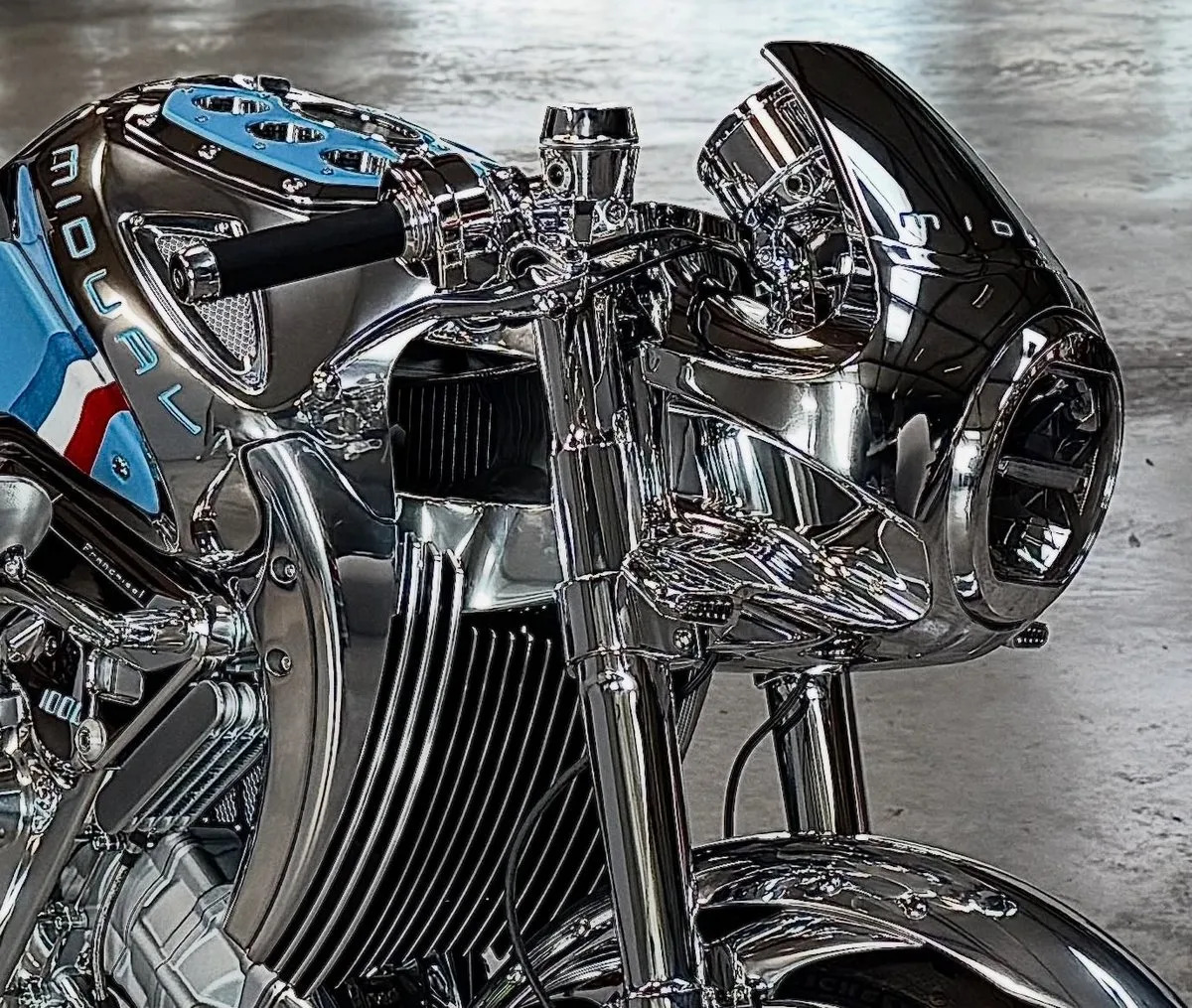 This exquisite cafe racer features a hand-polished aluminium monocoque frame, minimalist bodywork accustomed to neo-retro designs, a round LED headlight, aero winglets, an analogue dash, and sculpted exhausts. The bodywork features a clean raw metal finish without the need for an external paintwork, except to highlight a few panels and brand insignias.