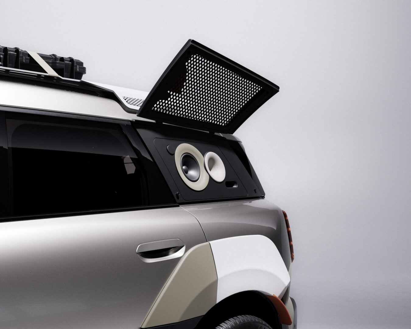 The tweeters and midrange speakers are integrated into the vehicle’s body, while the subwoofers are mounted in the rear of the car. With the tailgate open, the sound system broadcasts outward, thereby making the car a portable sound source.