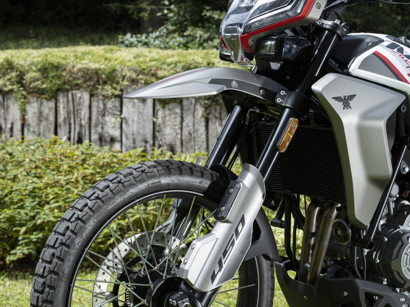 The Moto Morini Alltrihike 450 uses a steel frame with an aluminium swingarm, while the suspension hardware consists of proper off-road-ready equipment such as a 41mm KYB upside-down fork at the front and a KYB rear monoshock with linkage. Front travel is reported at about 208mm to 210mm, while the rear gets 190mm of travel.