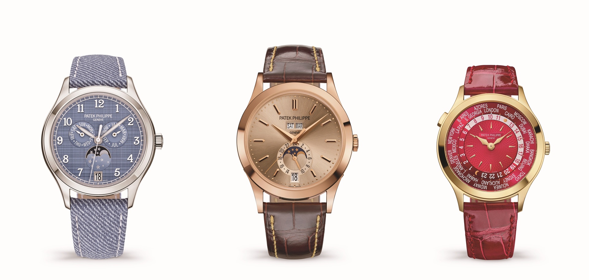 Patek Philippe has unveiled three models for Watches and Wonders Geneva 2026. They include the: Annual Calendar Reference 5396R-016 (middle on image), Annual Calendar Reference 4946G-001 (left on image) and World Time Reference 7129J-001 (right on image).