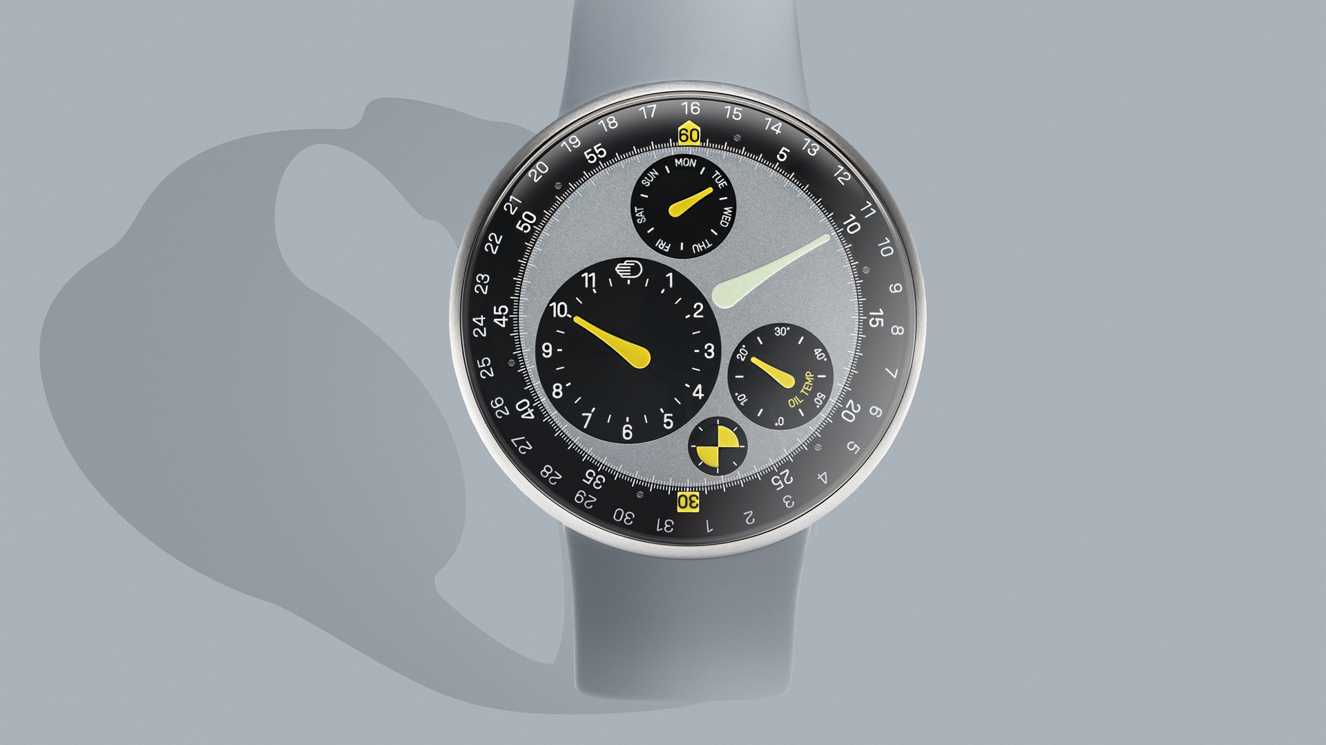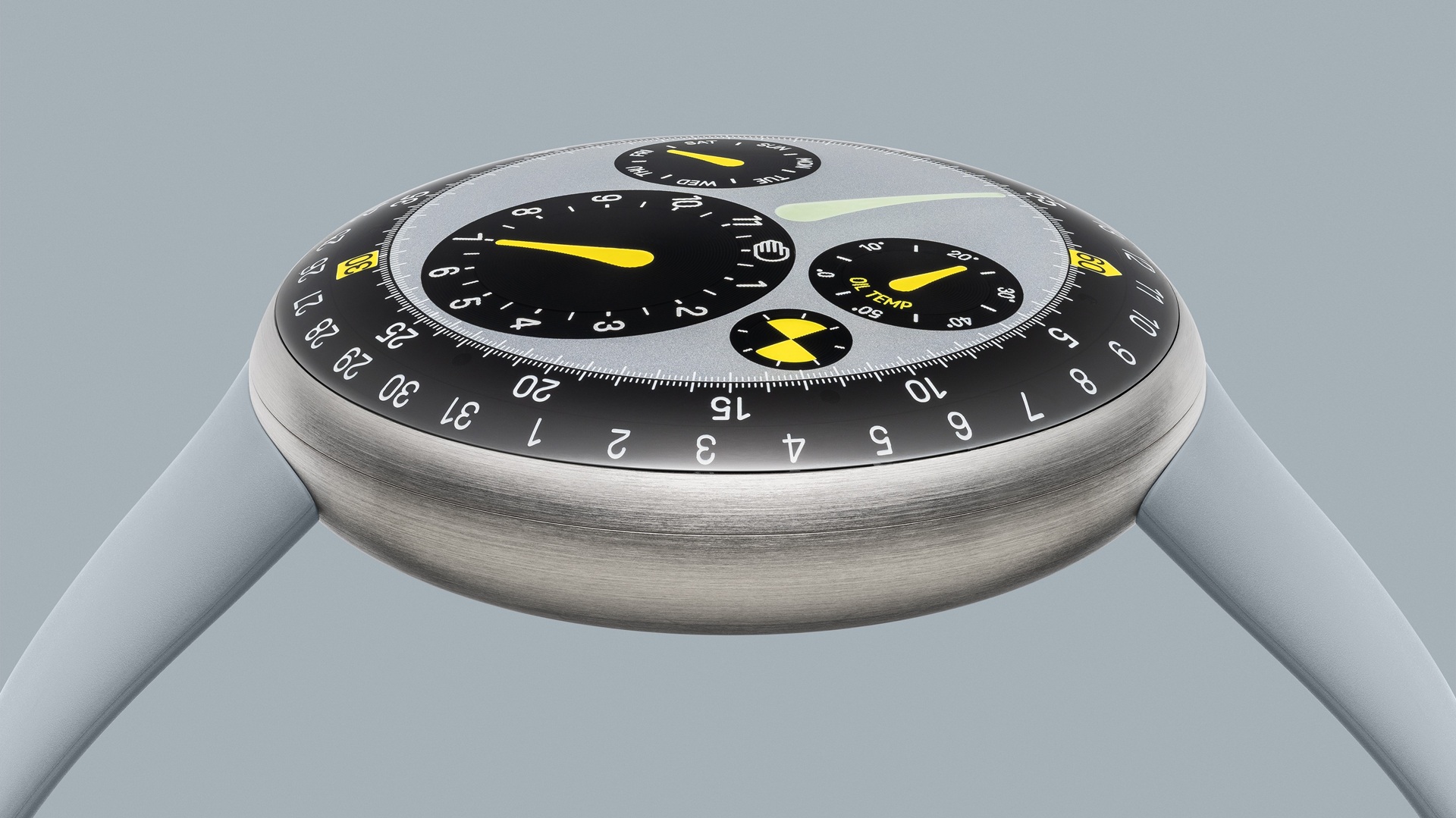 Dial is made from DLC and PVD coated Grade-5 titanium. It features convex Grade 5 titanium discs (125 mm radius) with 4 eccentric biaxial satellites that are inclined at 3° (hours), 4.75° (oil temperature and day of the week), 6.25° (runner). Indications are engraved and pad printed, and feature blue and green Grade A Super-LumiNova.