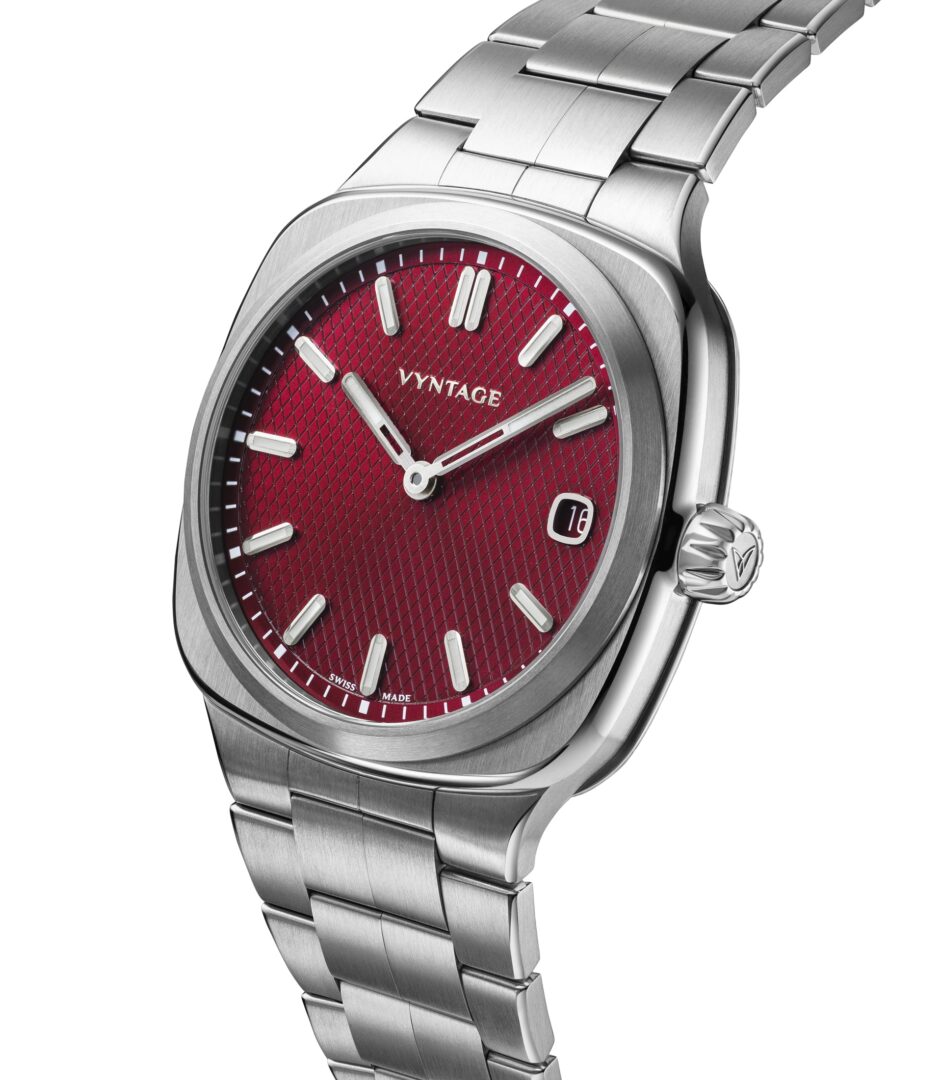 Burgundy-coloured dial with a unique “Diamond Tessellation” pattern. The silvered hour and minute hands and hour-markers are brushed, feature polished bevels, and filled with Super-LumiNova C1 X2 GL.