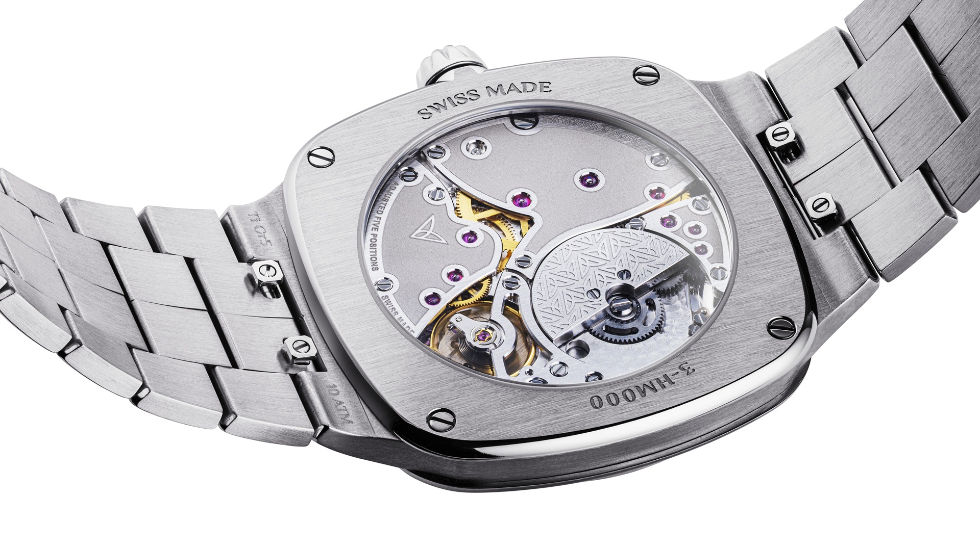Powered by calibre VHM-3.01, an automatic movement crafted by Vaucher Manufacture Fleurier that drives the hours, minutes, and date. Diameter: 30 mm. Thickness: 3 mm. Parts: 160. Jewels 29. Frequency: 21,600 vph or 3 Hz. Power reserve: 48 hours. Movement features a variable-inertia or free-sprung balance wheel, and an off-centered micro-rotor crafted from tungsten.